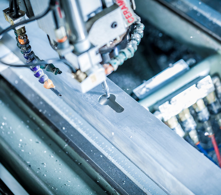 In unserem Profilbearbeitungszentrum bereiten wir die Elemente für das Zusammenbauen vor, indem sämtliche Bearbeitungen wie die erforderlichen Fräsungen, Bohrungen und Ausklinkungen hergestellt werden – hier der Ausschnitt für einen Profilzylinder.